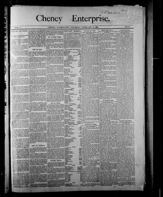 Amongst the many news items in this issue are a listing of prices from the Portland Market, a column by Women's Christian Temperance Union leader Lucy A. Switzer, an article summarizing Cheney's challenging past and promising future, news from the Farmer's Alliance and the city council, and the resignation of Mayor Garrettson.