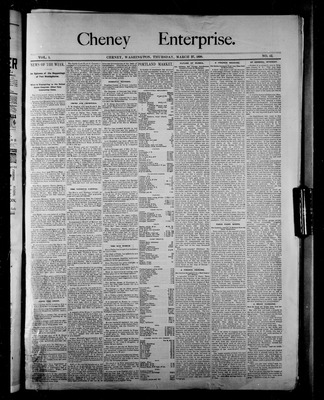 Amongst the many news items in this issue are a listing of prices from the Portland Market, a column by Women's Christian Temperance Union leader Lucy A. Switzer that includes a summary of a meeting in Spokane, a letter from the Farmer's Alliance, a letter to the editor about a need for another bank in Cheney, and a rail line from Latah to Cheney.