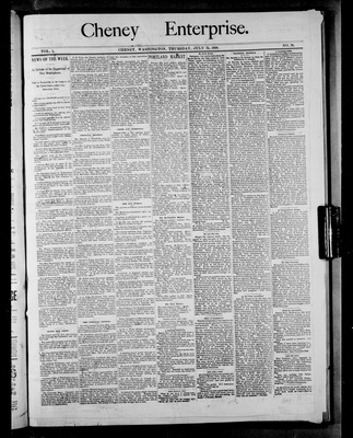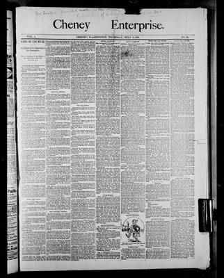 Amongst the many news items in this issue are a listing of prices from the Portland Market, a column by Women's Christian Temperance Union leader Lucy A. Switzer titled "Canteen System", a promotional story on the Northern Pacific Railroad, news from Granite Lake and Tucker Prairie, and the Fourth of July celebration in Cheney.