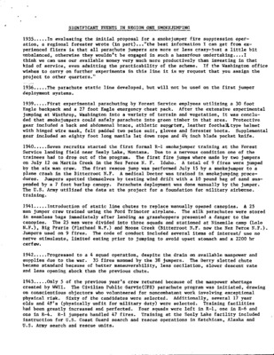 This document provides a chronology of significant events for the Missoula Smokejumper Base, which serves United States Forest Service Region One. The chronology starts in 1935 with an initial proposal to use parachute jumpers to fight wildland forest fires to 1975, which happened to be a historically slow fire season.
