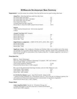 Smokejumper reports typically contain a roster of jumpers, data on jumps (including practice jumps), list of aircraft, a summary of fire activity, cooperation with other agencies, and data on training and injuries. Reports may also contain narrative overview of the year, data on fire size, and organizational charts.