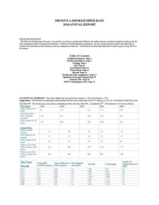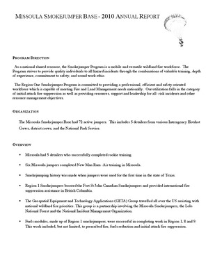 The Missoula Smokejumpers Base annual reports contain a summary of activities during the year related to practice and fire jumps. This report also includes information about the opening of a base in Miles City, Montana and its first year of operation.